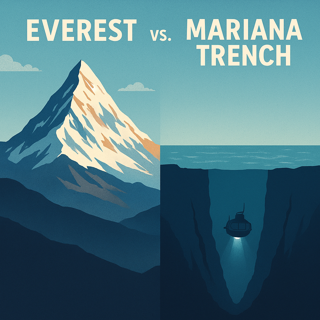 Pe planeta Pământ există două puncte care par să funcționeze ca niște repere ale limitelor naturale: vârful Everest și Groapa Marianelor. Unul se ridică mai sus decât orice alt loc de pe uscat, celălalt coboară mai adânc decât orice alt punct al scoarței terestre. Între ele se întinde o distanță nu doar fizică, ci și simbolică — o poveste despre înălțimi și abisuri, despre ambiție și introspecție.