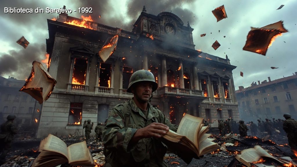 Bibliotecarii și voluntarii au încercat să salveze volumele, formând lanțuri umane și scoțând cărțile prin ferestre, sub focul lunetiștilor. Nu apărau doar rafturi, ci ideea că o civilizație trăiește prin cuvintele ei.